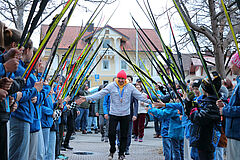 Begleitet von der Harmoniemusik zog Philipp Nawrath gemeinsam mit Gästen und Vereinsvertretern zur Halle ein. Für einen emotionalen Moment sorgte der Nachwuchs des Skiklubs, der vor der Alpspitzhalle Spalier stand und seinen erfolgreichen Vereinskollegen willkommen hieß.